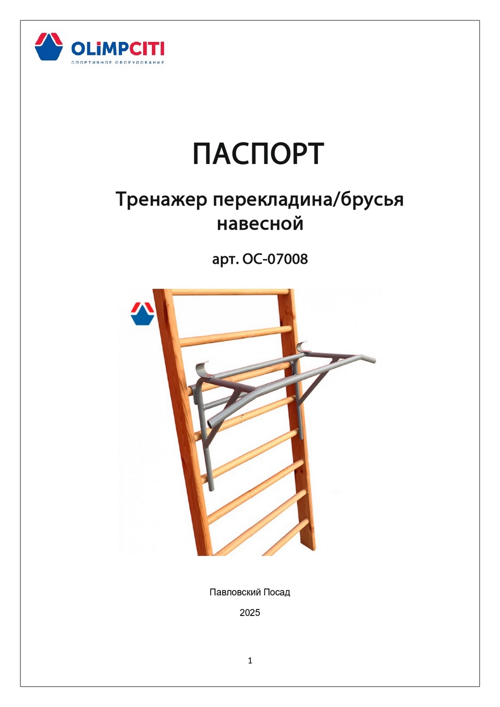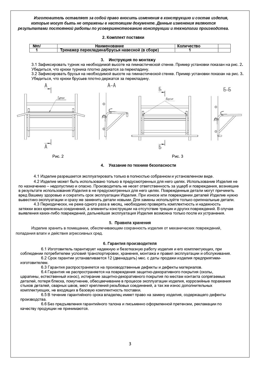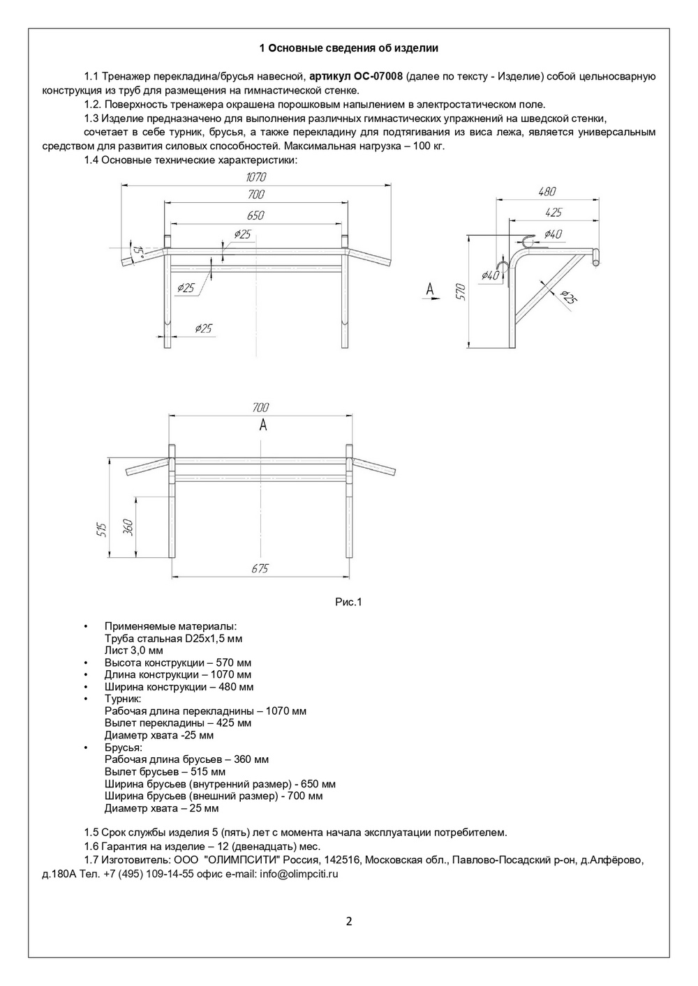 1. Тренажер перекладина/брусья предназначен для выполнения различных гимнастических упражнений на шведской стенки, сочетает в себе турник, брусья, а также перекладину для подтягивания из виса лежа, является универсальным средством для развития силовых способностей. Максимальная нагрузка – 100 кг.