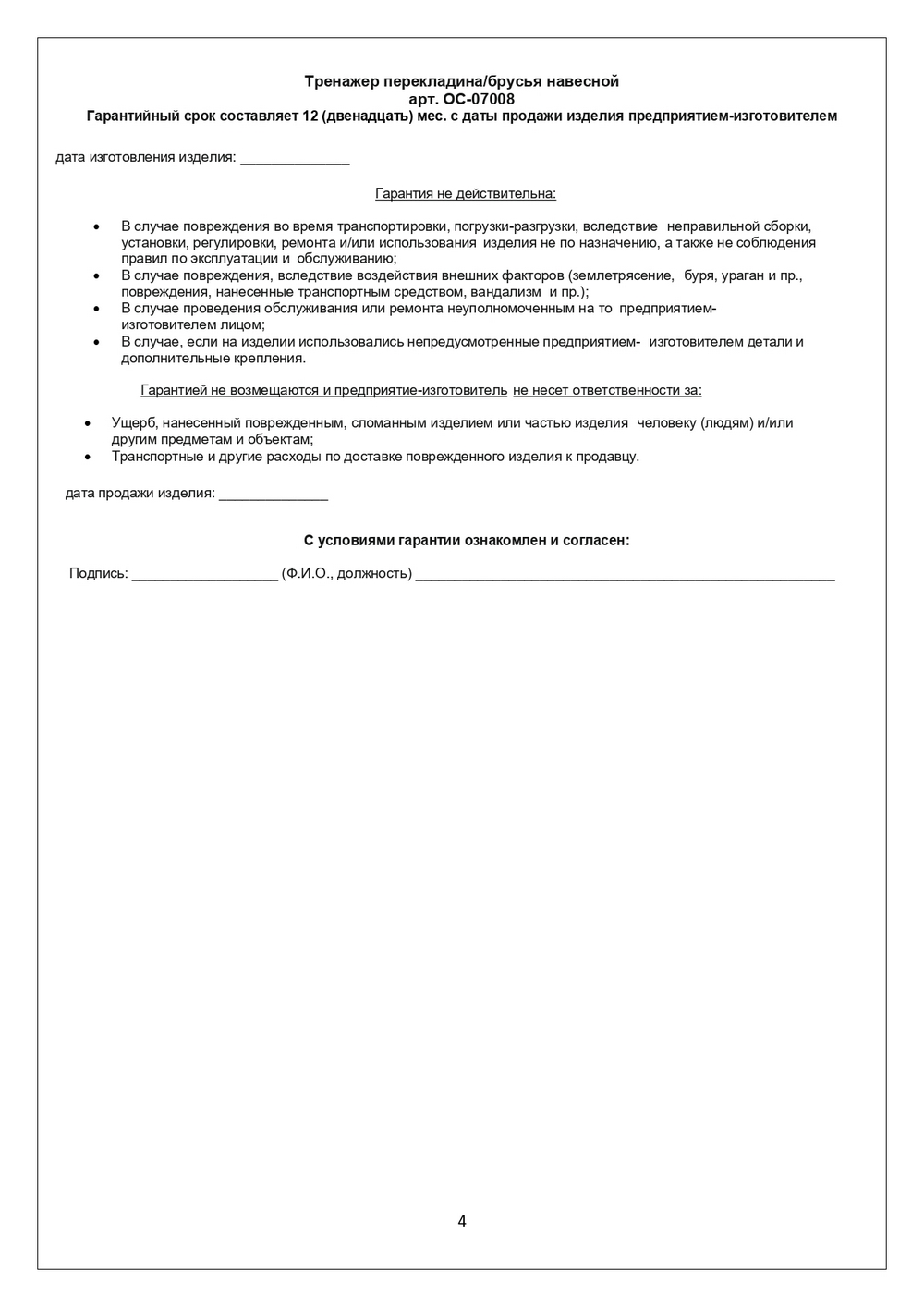 4.3 Периодически, не реже одного раза в месяц, необходимо проверять комплектность и надежность затяжки всех крепежных соединений, а элементы конструкции на отсутствие трещин и других повреждений. В случае выявления каких-либо повреждений, дальнейшая эксплуатация Изделия возможна только после их устранения.