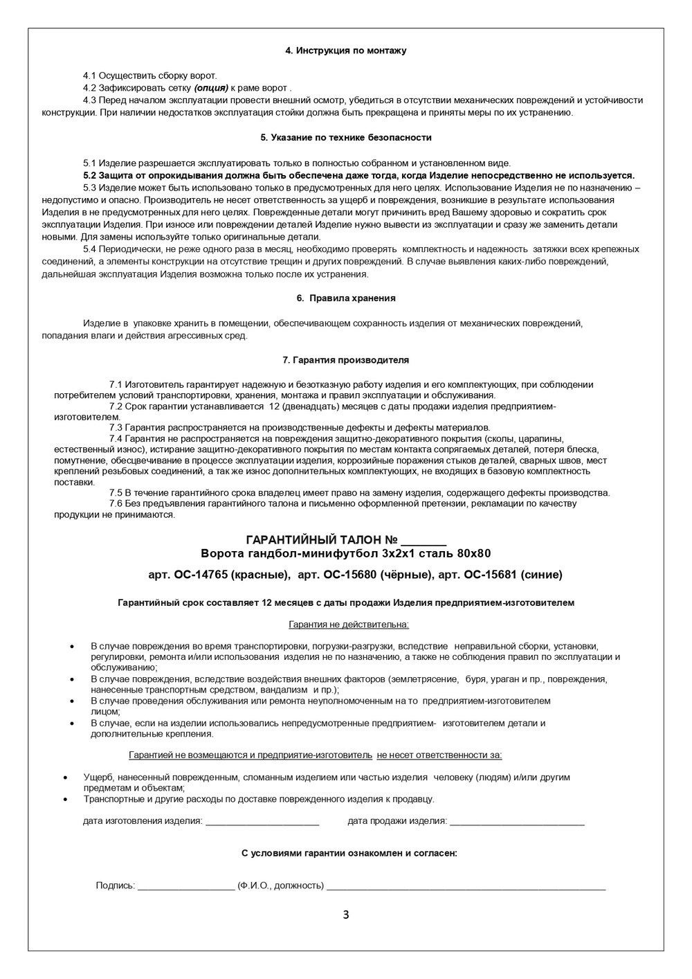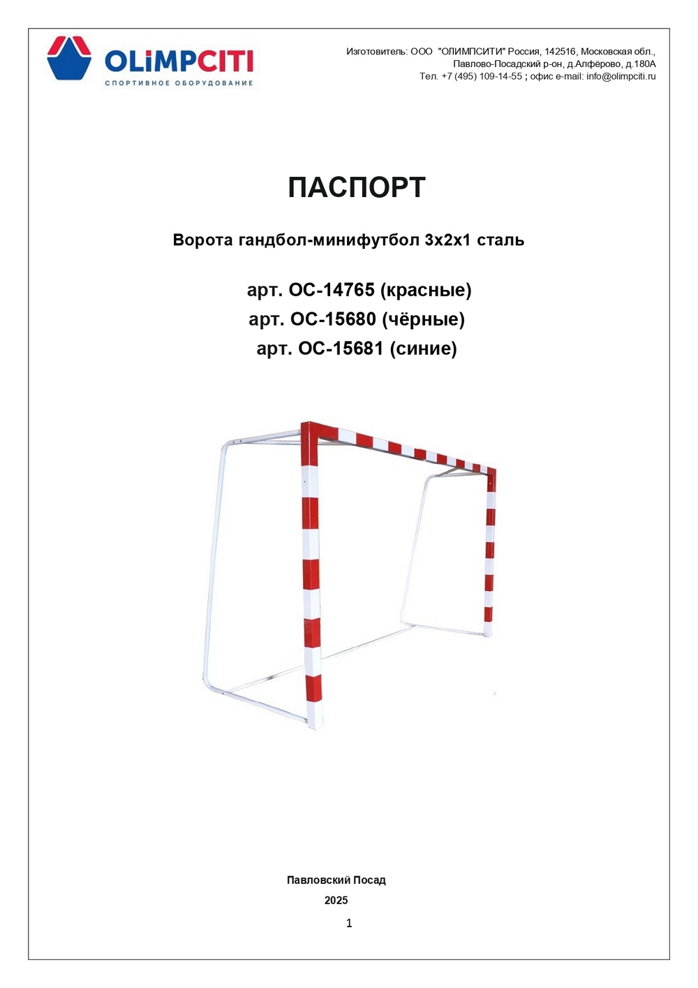 1.1 Ворота гандбол-минифутбол 3х2х1 сталь, артикул ОС-14765 (красные), ОС-15680 (чёрные), ОС-15681 (синие) (далее по тексту - Изделие) представляют собой сборно-разборную конструкцию, состоящую из правой и левой боковин, соединённых вверху перекладиной, а внизу горизонтальной стяжкой.